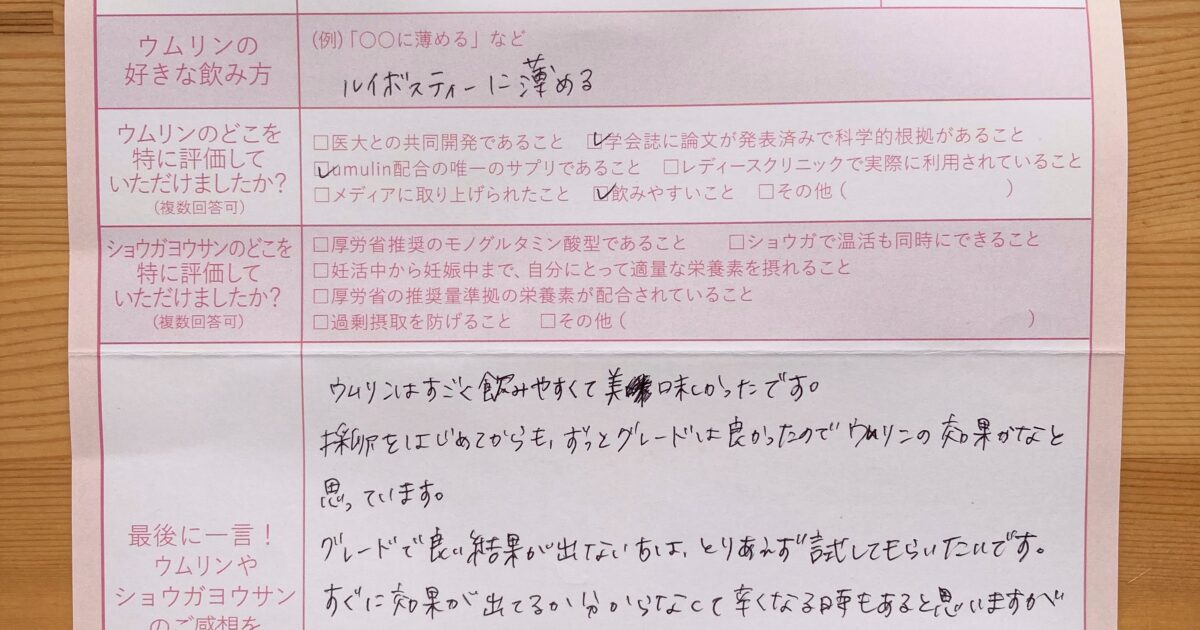 ウムリンはすごく飲みやすくて美味しかったです。 良い結果が出ない方は、とりあえず試してもらいたいです。すぐに効果が出てるか分からなくて辛くなる時もあると思いますが諦めず続けて欲しいです。 ありがとうございました。