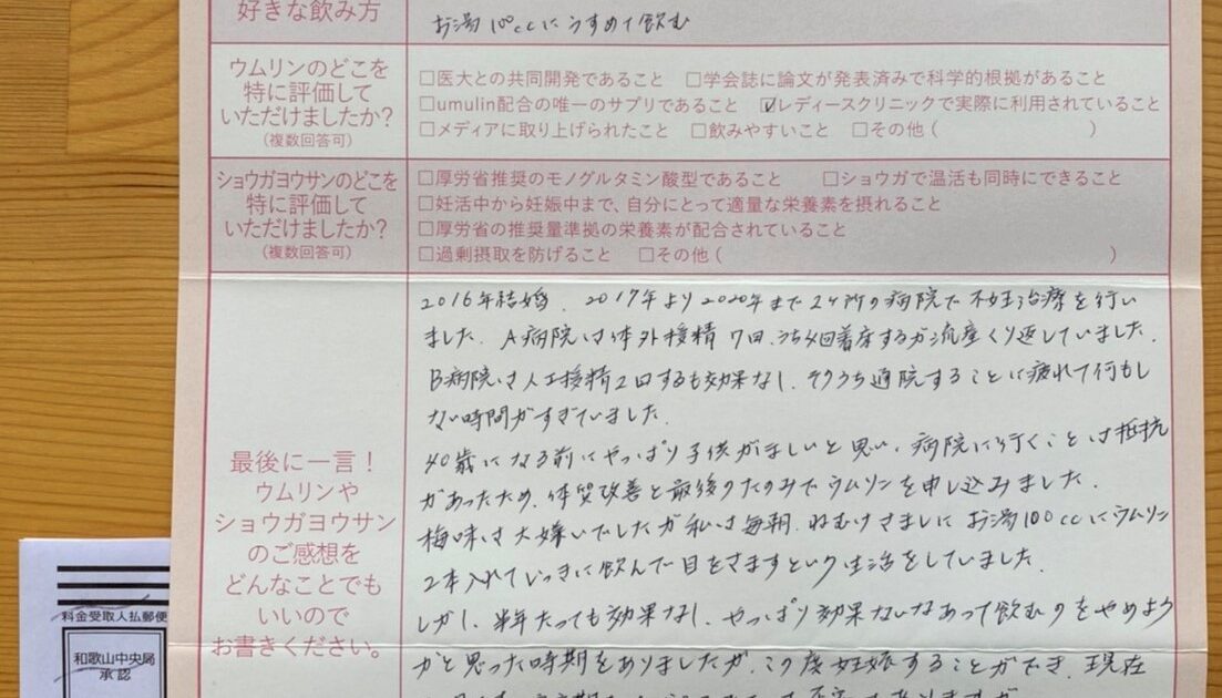 ウムリンを4月頭から飲用させて頂きました。 ウムリンを飲み始めてから、”これで大丈夫な気がする!”と前向きに気持ちを切り替えられたことも大きかったように思います。 ウムリンは葉酸の吸収力を高め死産 […]