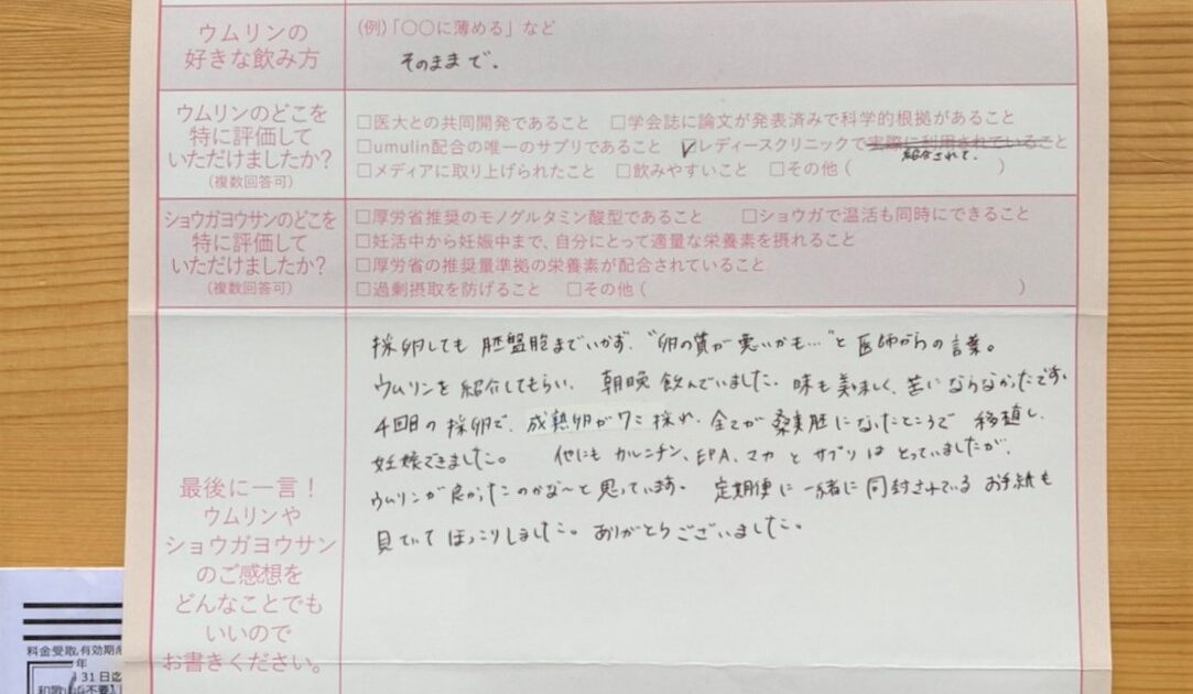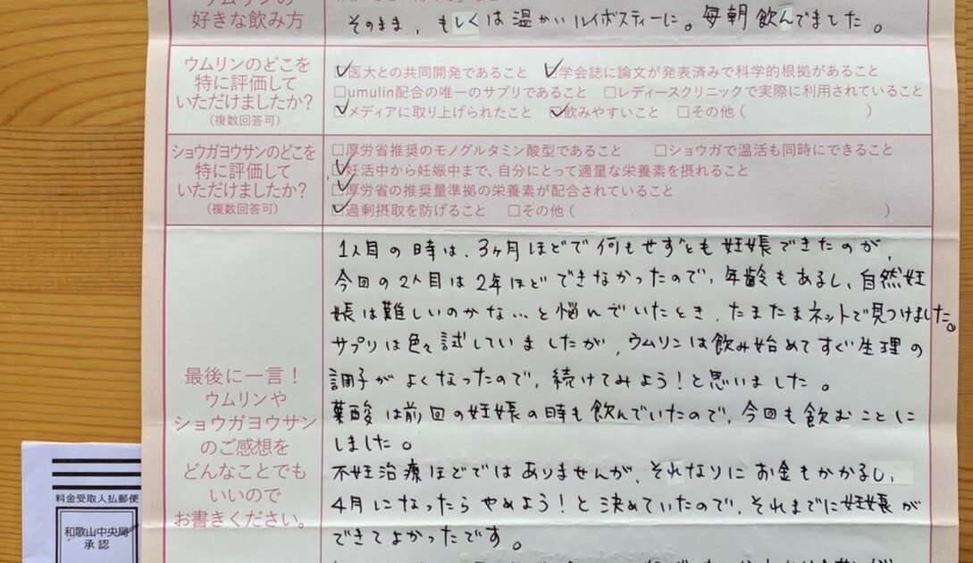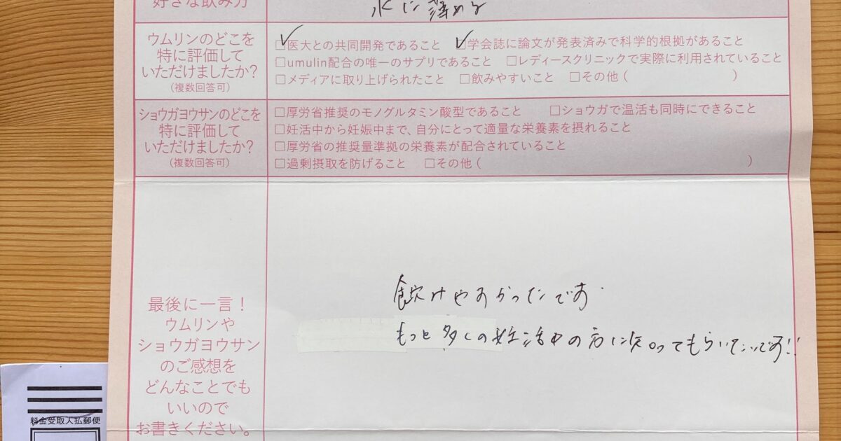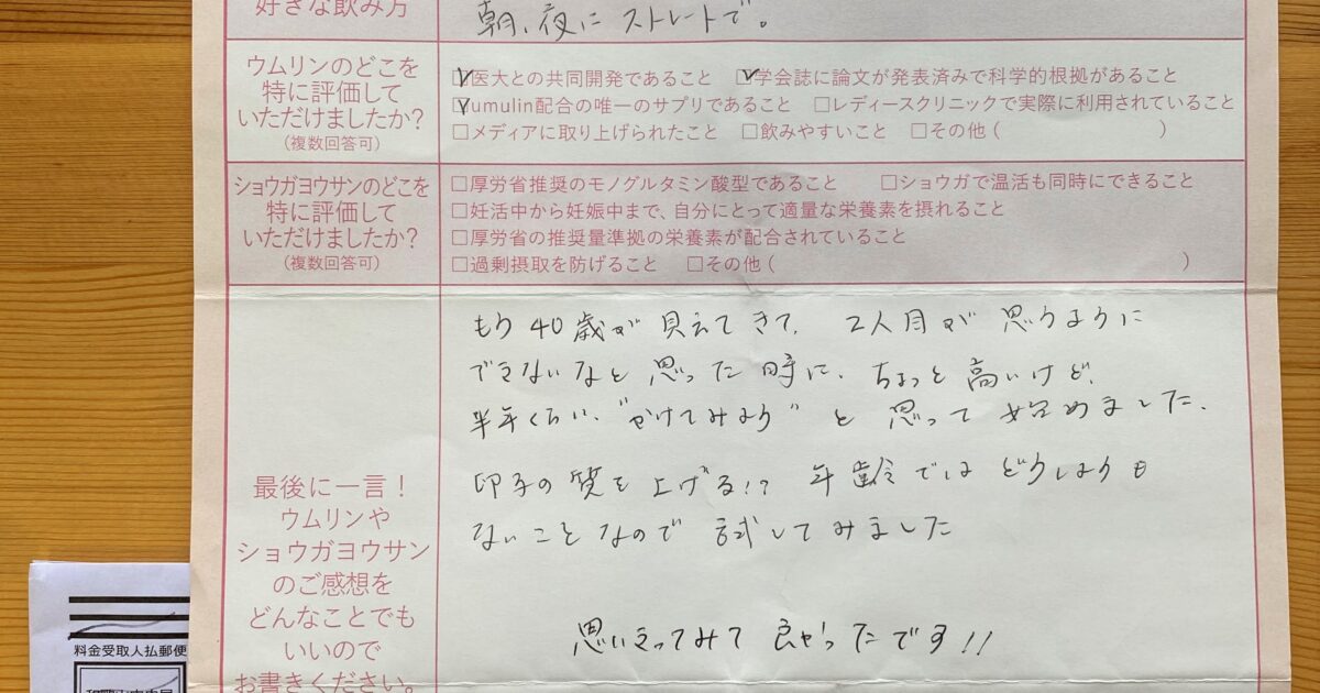 ウムリンを紹介してもらい、朝晩飲んでいました。味も美味しく、苦にならなかったです。 定期便に一緒に同封されているお手紙も見ていてほっこりしました。ありがとうございました。