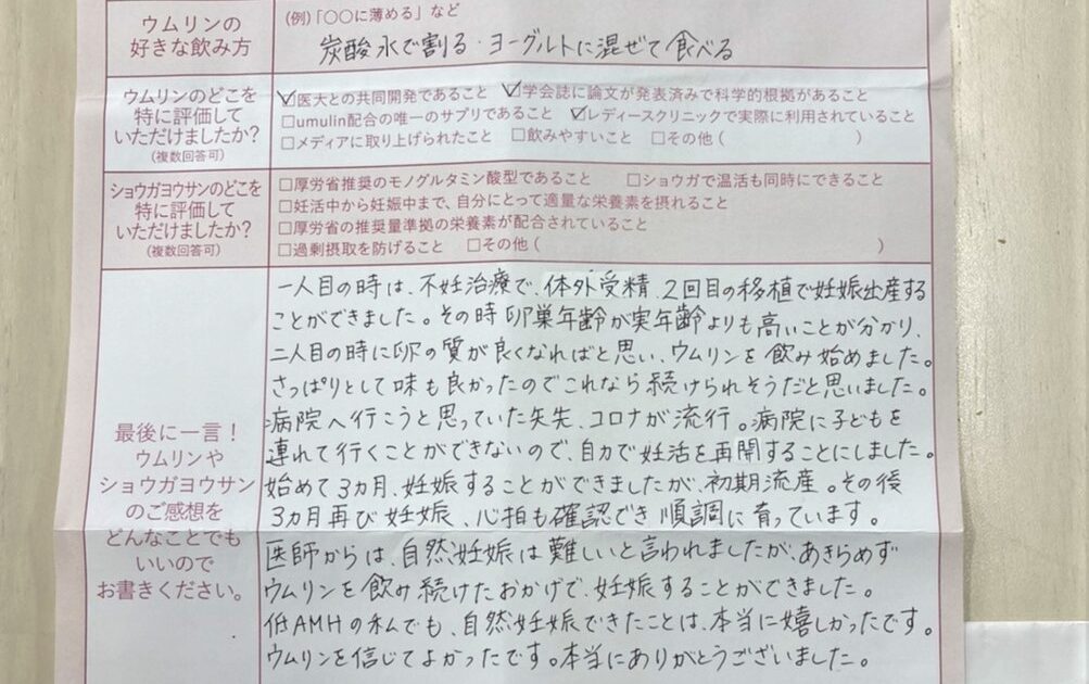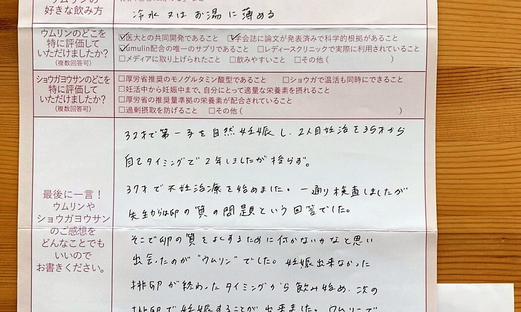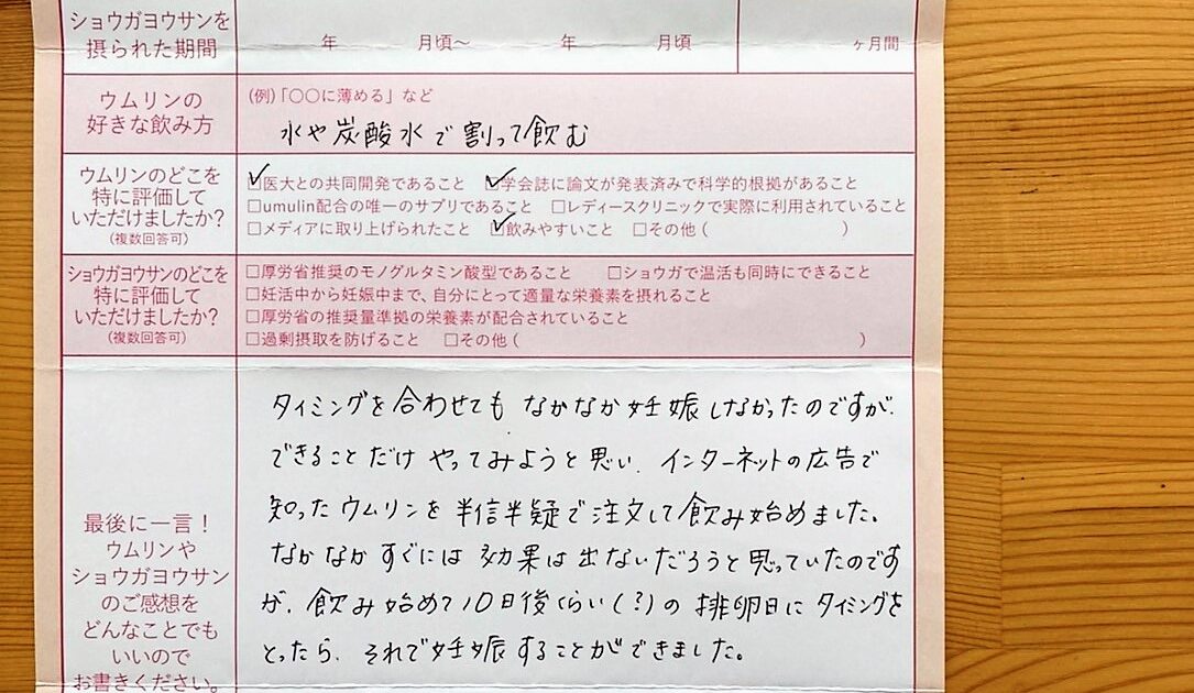 できることだけやってみようと思い、インターネットの広告で知ったウムリンを半信半疑で注文して飲み始めました。 こんなにすぐだとは思っていなかったので、びっくりしましたが嬉しかったです。ありがとうございます。