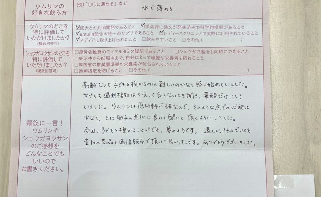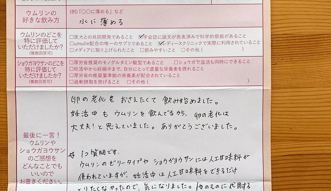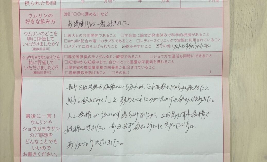 高齢で不安に思っていたところ、同い年の友人に勧められて飲みはじめました。 忙しくていつも続きませんでしたが、ウムリンはとても飲みやすく普段の食事に取り入れやすかったので毎日つづきました。 本当にありがとうございました!
