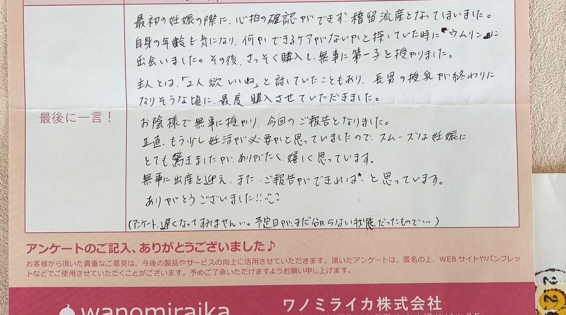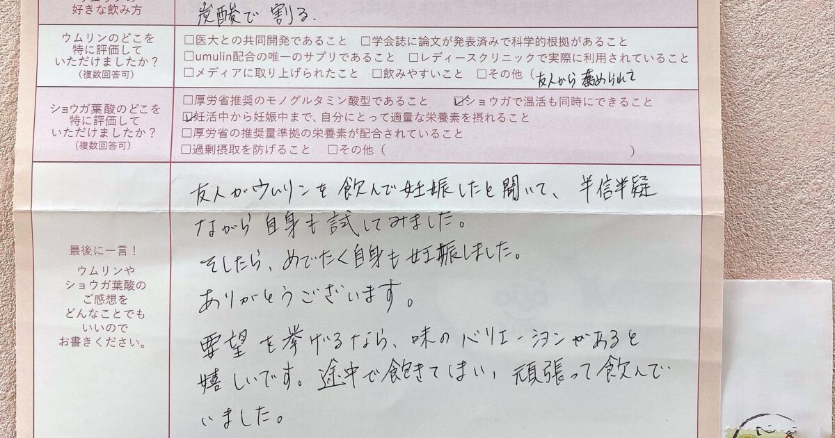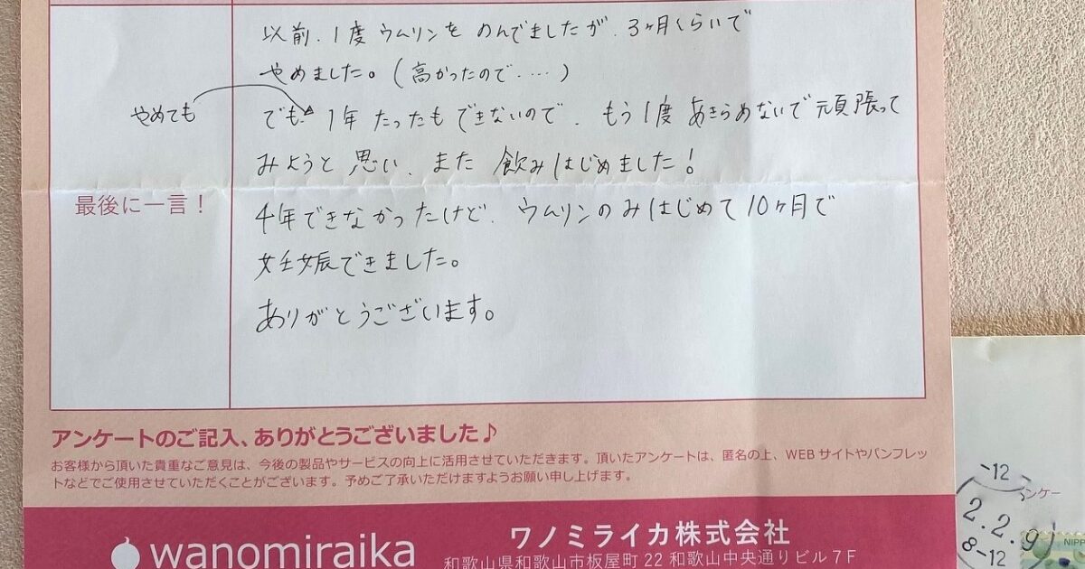結婚して3年経過してもなかなかさずからず、年齢も35才をすぎていたので、何か少しでも変化・行動をしなくては、とネットを検索していた。ウムリンは水やサイダーに薄めて飲んだりヨーグルトに入れて食べたりしました。味もおいしかっ […]