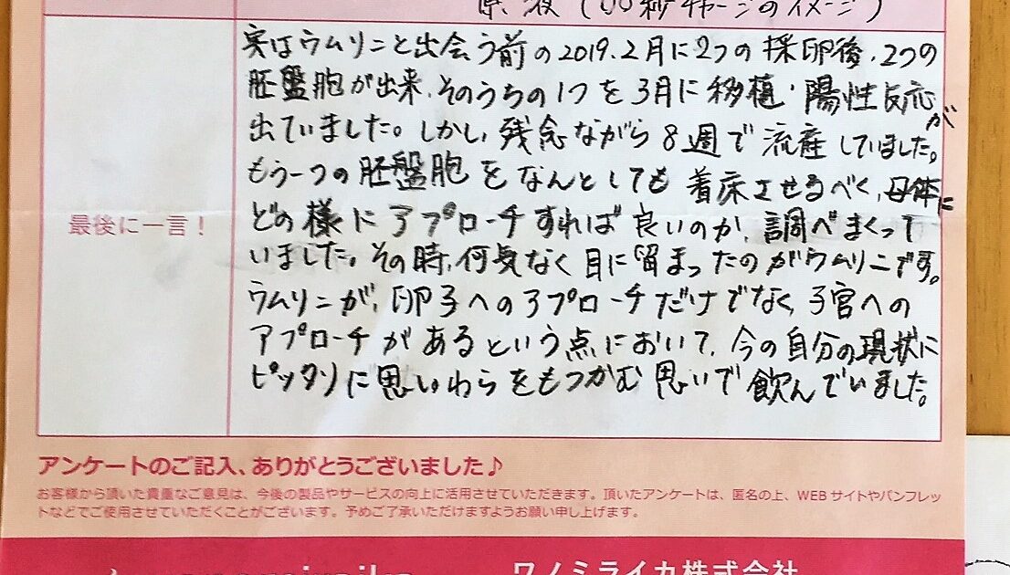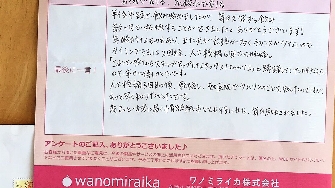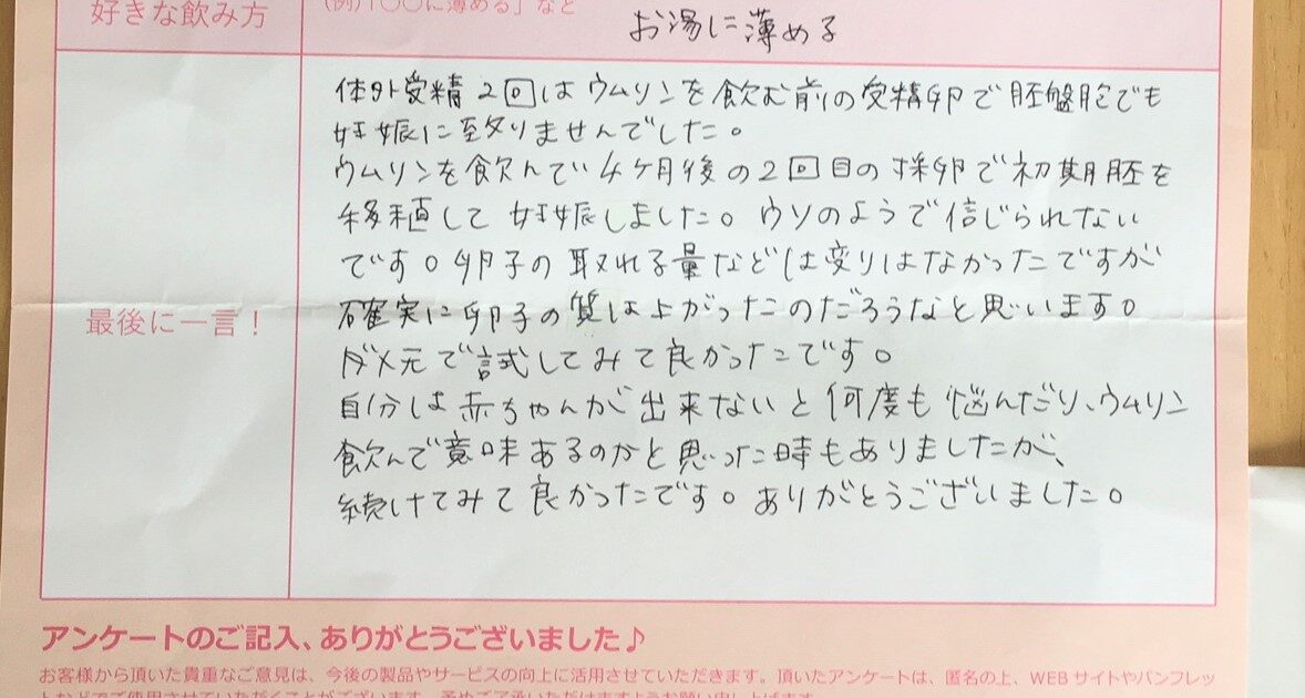 年齢があがるにつれできにくいという事を知りできやすい体質になるにはどうしたらいいのかネットを見ていました。ウムリンはとても飲みやすく美味しかったです。今はつわりが辛く美味しく感じていたウムリンも飲めなくなりましたが、落ち […]