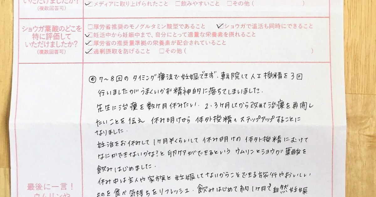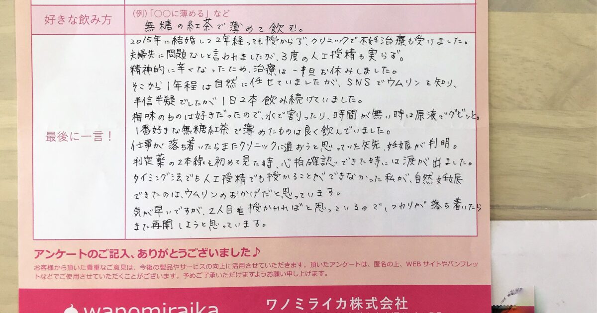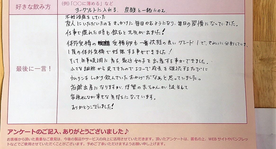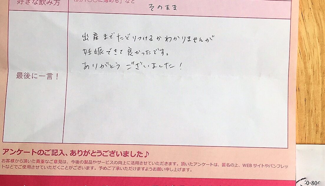 不妊治療をしていた友人にいただいたのをきっかけに毎日のむようになり、毎日の習慣になっていました。1度の体外受精で妊娠する事ができました!そして無事順調に育ち、最近女の子を出産することができました。高齢出産になりますが、待 […]