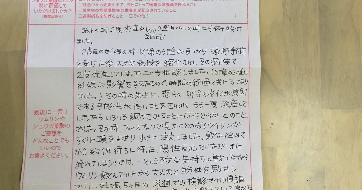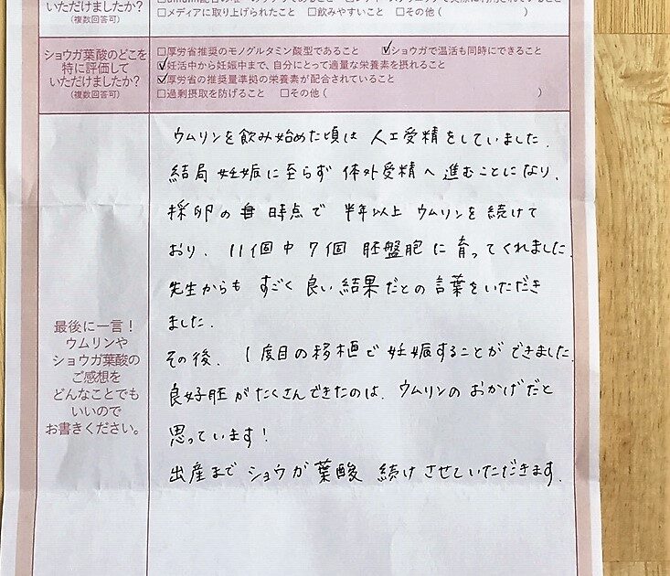 ウムリンを飲み始めた頃は人工授精をしていました。結局妊娠に至らず体外受精へ進むことになり、11個中7個胚盤胞に育ってくれました。先生からもすごく良い結果だとの言葉をいただきました。その後、1度目の移植で妊娠する事が出来ま […]