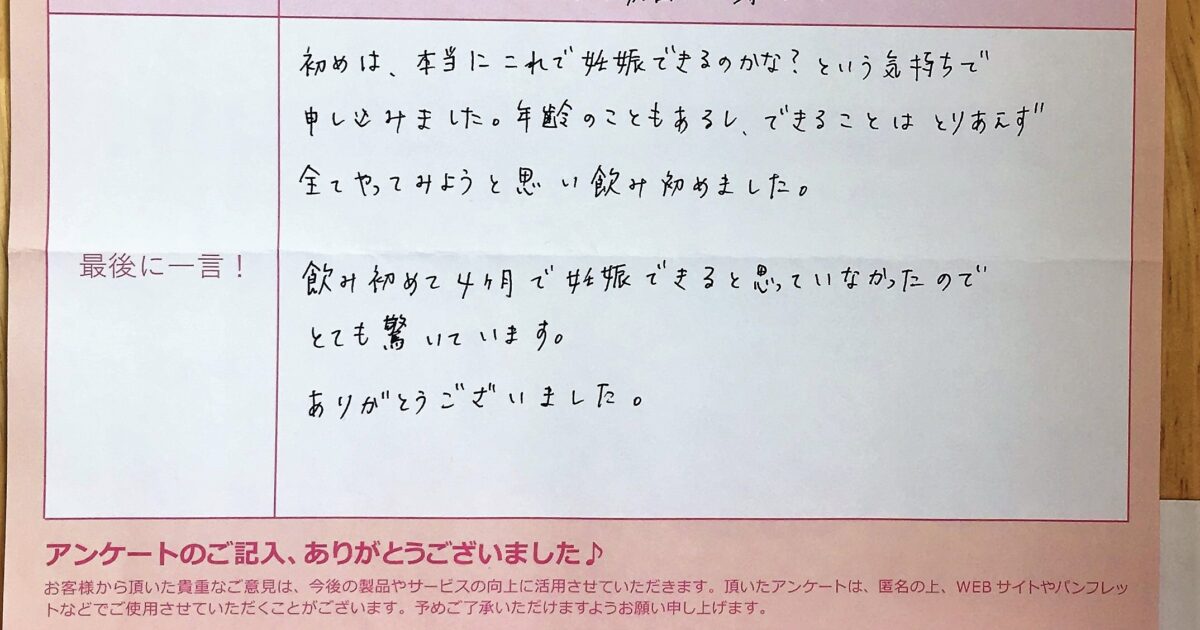 初めは、本当にこれで妊娠できるのかな?という気持ちで申し込みました。年齢のこともあるし、できることはとりあえず全てやってみようと思い飲み初めました。