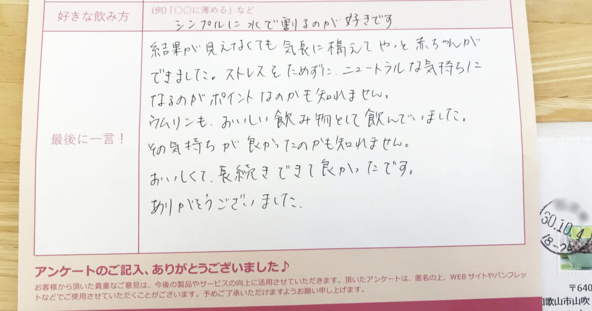 2人目を妊娠するまで長期間にわたりお世話になりました。今後も妊娠を希望する方のために開発を続けてくれればと思います。ありがとうございました。
