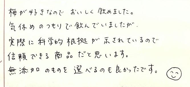 4767 梅が好きなのでおいしく飲めました。気休めのつもりで飲んでいましたが、実際に科学的根拠が示されているので信頼できる商品だと思います。無添加のものを選べるのも良かったです。