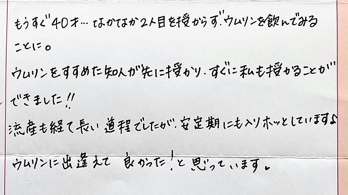 4477 年明けに死産してしまい、産院の先生に妊活宣言したものの40代の妊娠はなかなか難しいと言われ落ちこんでいた時に、気になっていたウムリンを飲むようになりました。不安な時、ウムリンの40代の方の口コミを見たり、送られてきた妊娠された体験談など読んで希望を持つことができました。またメールでも私にはウムリンが効果的と長文で✉下さり、とても心強く、そしてとてもはげまされました。結果1ヶ月経つか経たないかくらいで妊娠することができました。ただ無事に育って、産まれてくることができるようにウムリンを飲み続けたいと思います。(お腹の中の赤ちゃんが成長するためにも良いときいたので)もし今、高齢で不安を抱えている方がいたら本当にウムリンを飲んでみて欲しいと思います。そして私の口コミで明るい気持ちになってもらえたら嬉しいです。スタッフの皆様 妊娠報告の✉とても嬉しかったです。本当にありがとうございました。