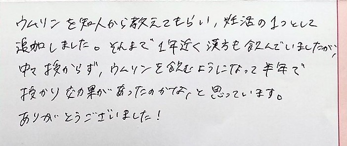 4024 ウムリンを知人から教えてもらい、妊活の1つとして追加しました。それまで1年近く漢方も飲んでいましたが、なかなか授からず、ウムリンを飲むようになって半年で授かり効果があったのかな、と思っています。ありがとうございました!