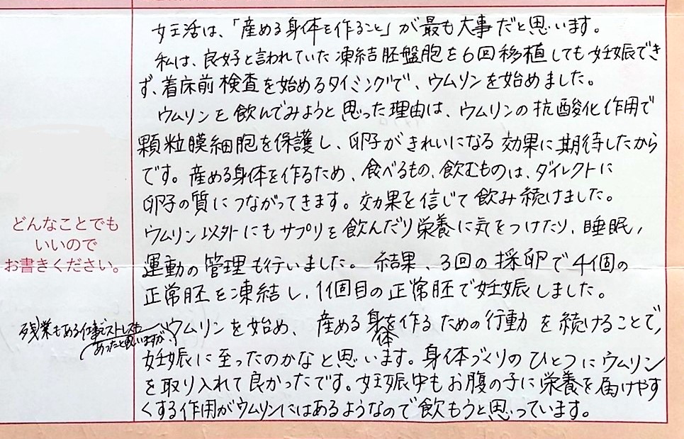 3211 妊活は、「産める身体を作ること」が最も大事だと思います。私は、良好と言われていた凍結胚盤胞を6回移植しても妊娠できず、着床前検査を始めるタイミングで、ウムリンを始めました。ウムリンを飲んでみようと思った理由は、ウムリンの抗酸化作用で 顆粒膜細胞を保護し、卵がきれいになる効果に期待したからです。産める身体を作るため、食べるもの、飲むものはダイレクトに卵子の質につながってきます。効果を信じて飲み続けました。ウムリン以外にもサプリを飲んだり栄養に気をつけたり、睡眠、運動の管理も行いました。結果、3回の採卵で4個の正常胚を凍結し、1個目の正常胚で妊娠しました。残業もある仕事でストレスもあったと思いますが、ウムリンを始め、産める身体を作るための行動を続けることで、妊娠に至ったのかなと思います。身体づくりのひとつにウムリンを取り入れて良かったです。妊娠中もお腹の子に栄養を届けやすくする作用がウムリンにはあるようなので飲もうと思っています。