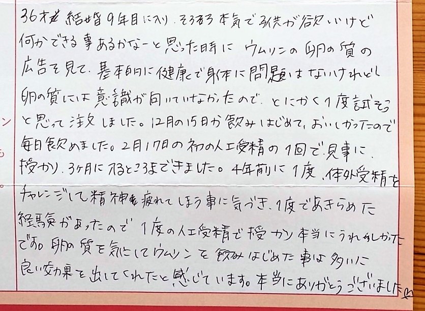 3279 36才 結婚9年目に入り、そろそろ本気で子供が欲いけど何かできる事あるかなーと思った時にウムリンの卵の質の広告を見て、基本的に健康で身体に問題はないけれど卵の質には意識が向いていなかったので、とにかく1度試そうと思って注文しました。12月の15日か飲みはじめて、おいしかったので毎日飲めました。2月17日の初の人工受精の1回で見事に授かり、3ヶ月に入るところまできました。4年前に1度、体外受精をチャレンジして精神を疲れてしまう事に気づき、1度であきらめ経験があったので、1度の人工受精で授かり本当にうれしかったです。卵の質を気にしてウムリンを飲みはじめた事は多いに良い効果を出してくれたと感じています。本当にありがとうございました♡