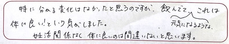 なんだかあやしい。だけど、卵子のためにできることなら始めてみよう!その気持ちで飲み始めました。おかげさまで、第二子を自然妊娠で授かることができ、安定期に入りました。もともと卵管が細く、第一子は不妊治療を経て凍結胚移殖にて授かりました。(2019年)2022年から凍結しておいた卵を何度か戻してみましたが妊娠には、いたらす。全て卵がなくなってしまいました。その時に知ったのが、ウムリンでした。味もおいしくて、一日二回(朝と風呂上がり)飲みました。元気が出る気がして続けることができました。ほんとうにありがとうございました。問い合わせたときにも親切に対応して頂き、ありがとうございました。