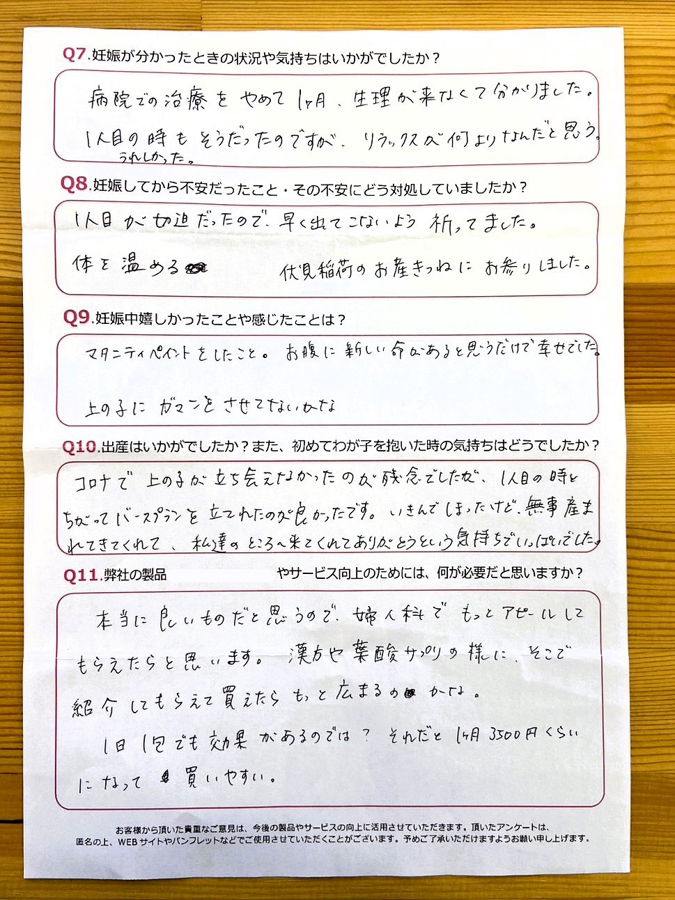 第一子も第二子を治療でさずかりました。第二子の時には、体外受精まで行い、毎日毎日9日の質が原因で移植までいけませんでした。ウムリンを飲んでいることを心の支えにしていました。ありがとうございました!