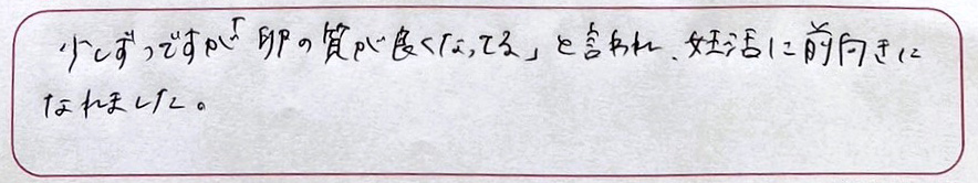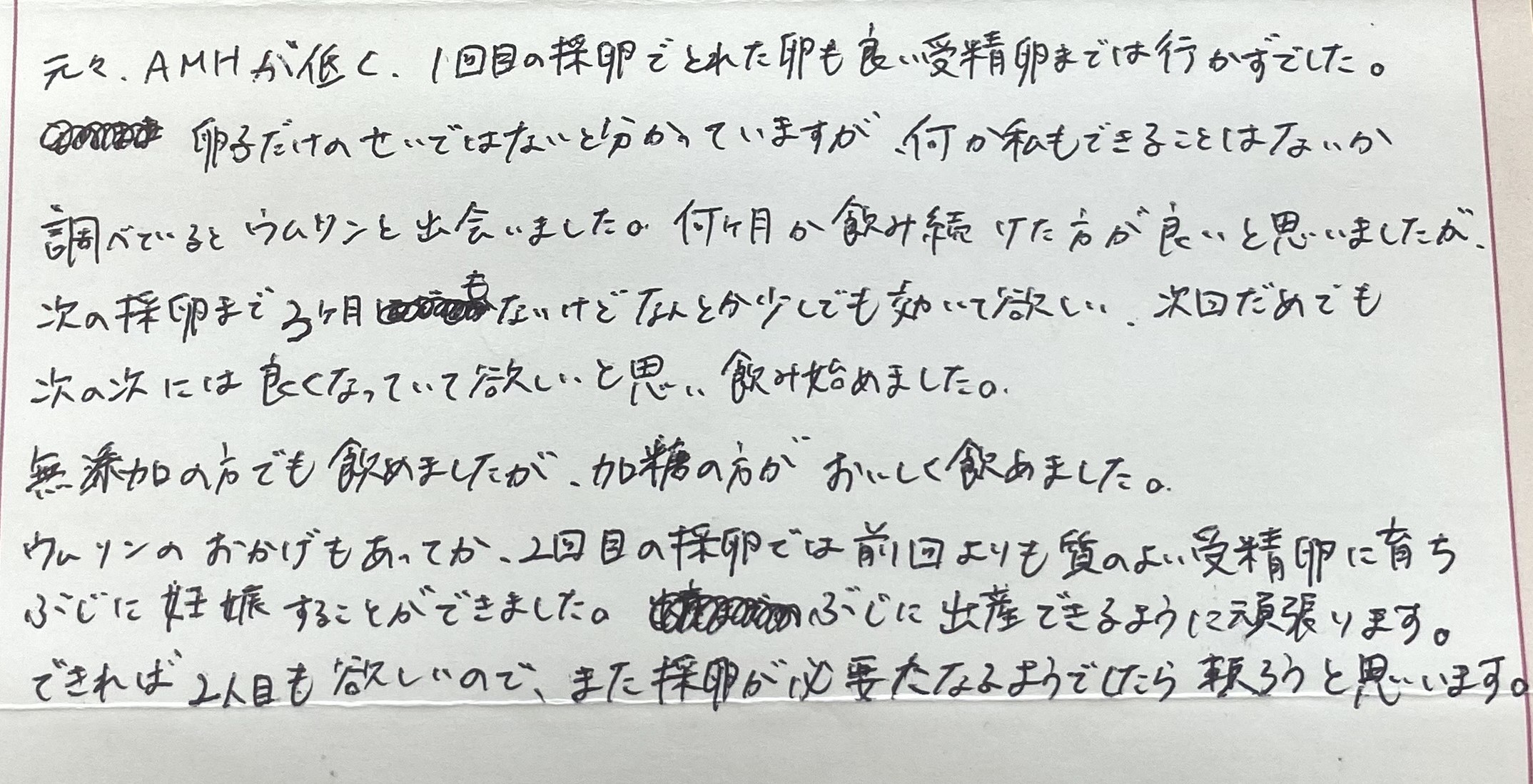 低amhで採取しても採れる数が少ない上に採れても空胞…ということが続き、心が折れていたところウムリンに出会い、いい卵ができるように祈りながら飲み続けました。ウムリンを飲み出してからの採卵で過上最高の数がとれ、そこから受精→移植とすすむことができました。良い結果となったのはウムリンのおかげもあると思います。出会えてよかったです。ありがとうございます。