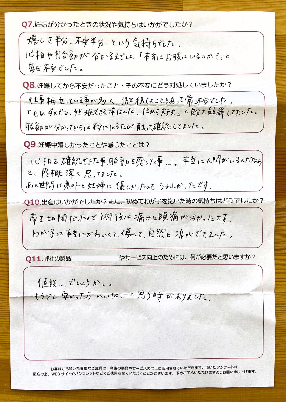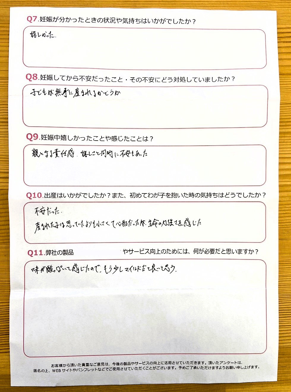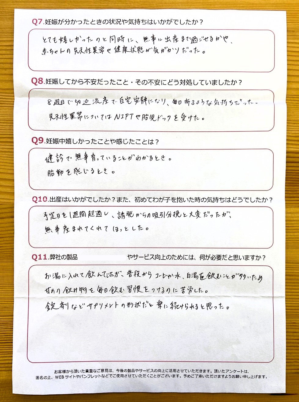 今回の妊娠前に流産を経験しました。初期流産は染色体異常が原因と言われました。「卵子の老化は防げない。では流産を経験しない為に何をどう対策したらよいのだろう…」と、とても悩みました。その時にウムリンを見つけ、少し値段は苦しかったですが、できることは何でもしたいと思い飲み始めました。他にも色々試してはいましたが、妊娠発覚後も「きっと今回は大丈夫。良い卵のはず」と思えました。ありがとうございました。