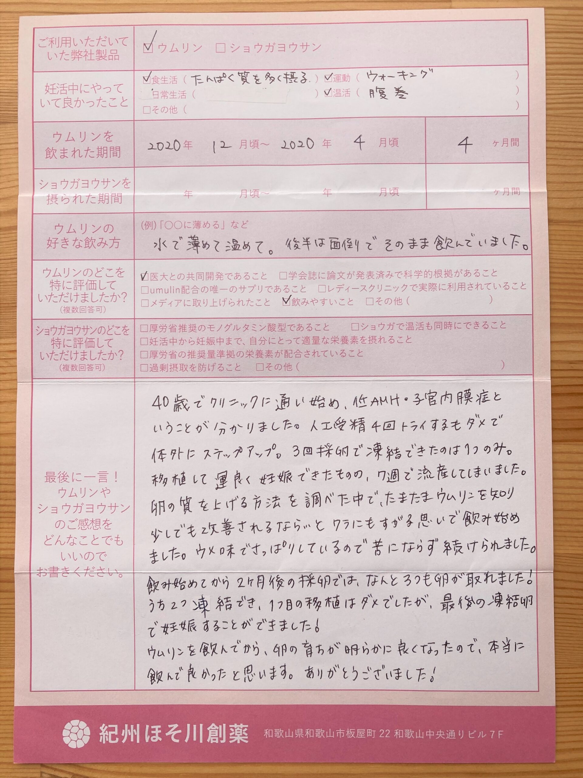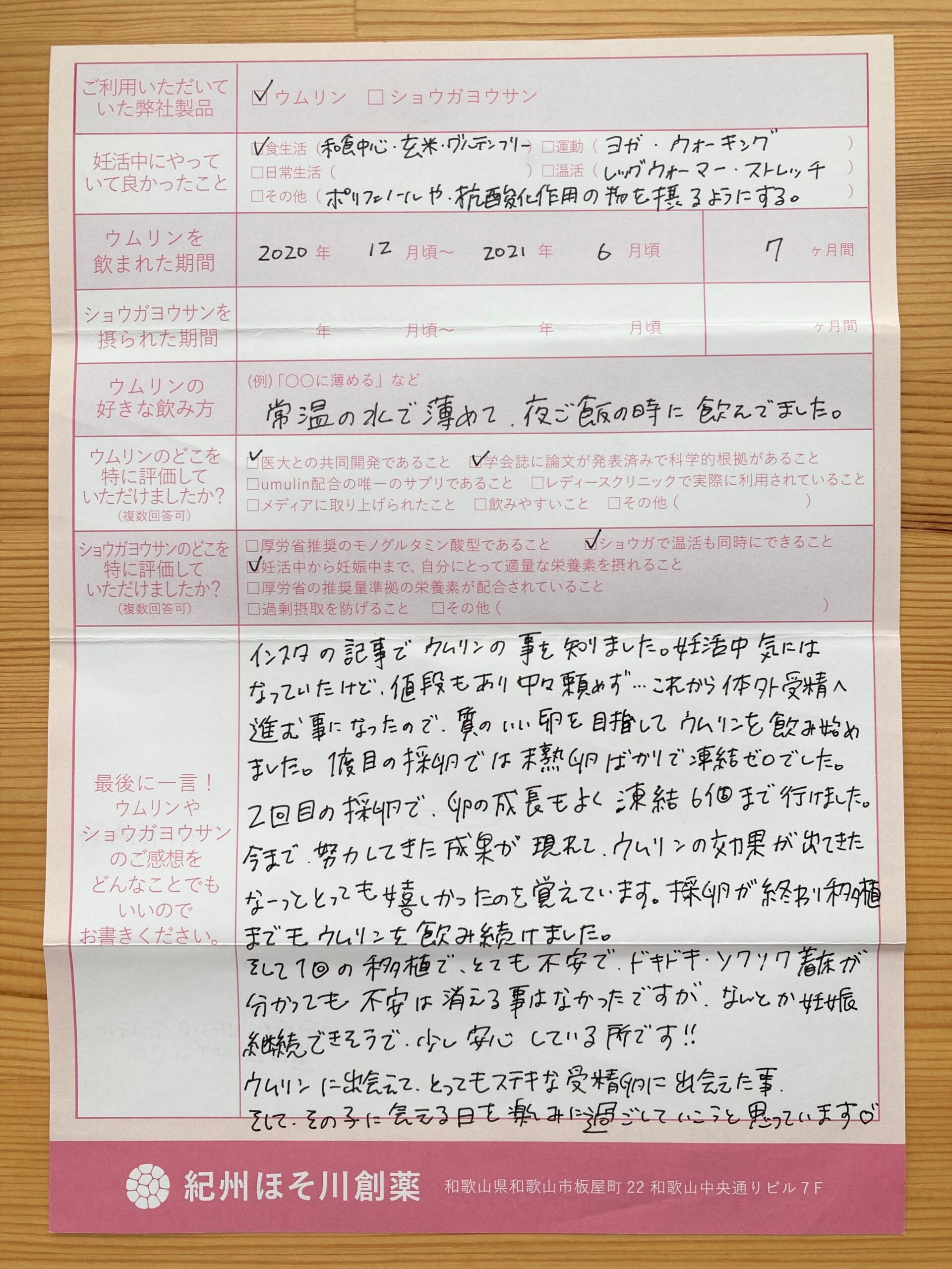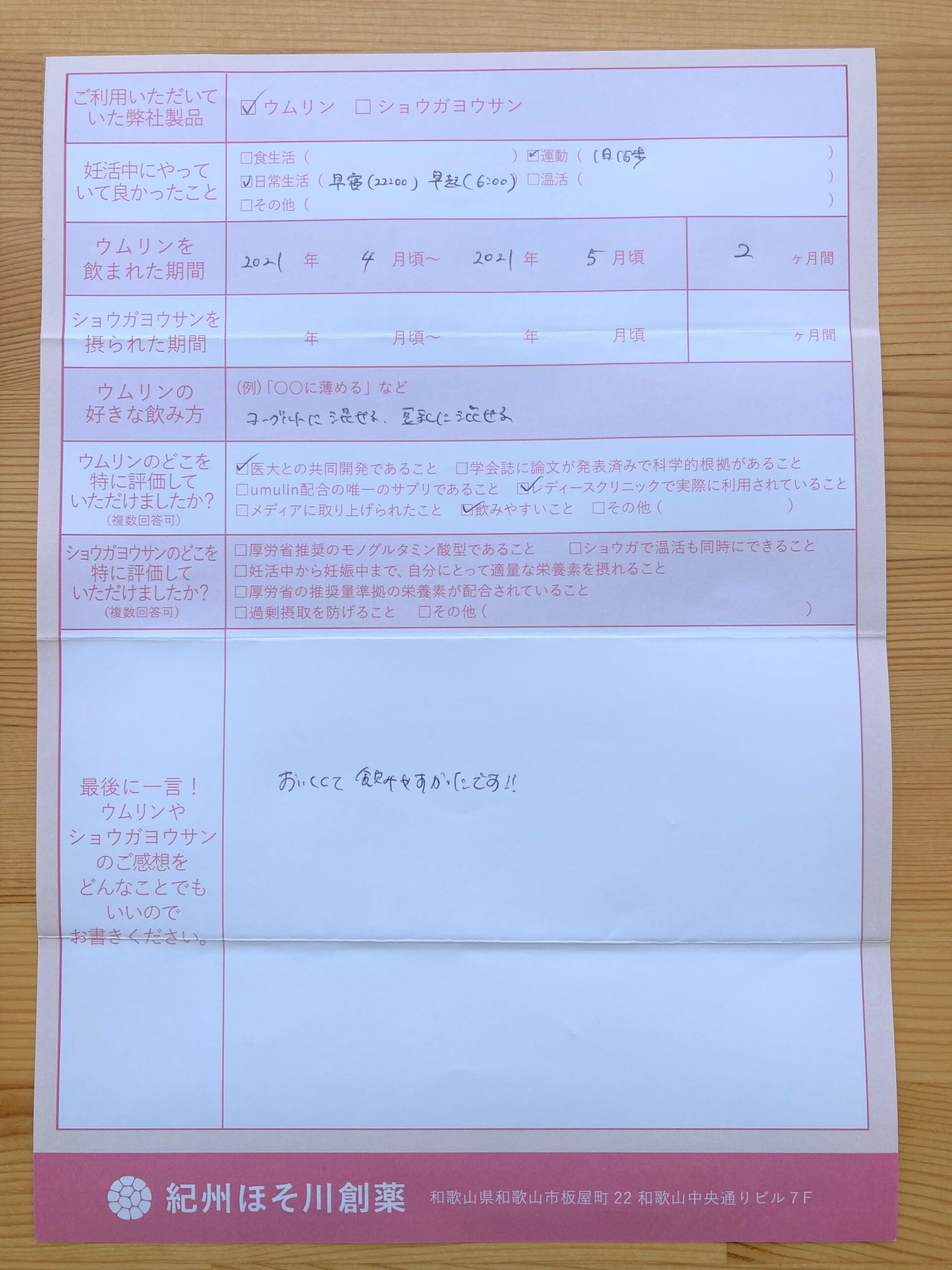 ウムリンのおかげかは分かりませんが、とてものみやすく、科学的根拠のあるサプリなので飲み続けようと思いました。 この度は飲んだ期間も2ヶ月弱で妊娠に至りましたが、ウムリンの他にも食生活の改善、定期的な運動、鍼灸通い、ストレスレスな生活など総合的な取り組みによって妊娠したと思います。体外受精ではなく、通院をやめてお休み期間で人生初めての自然妊娠です。