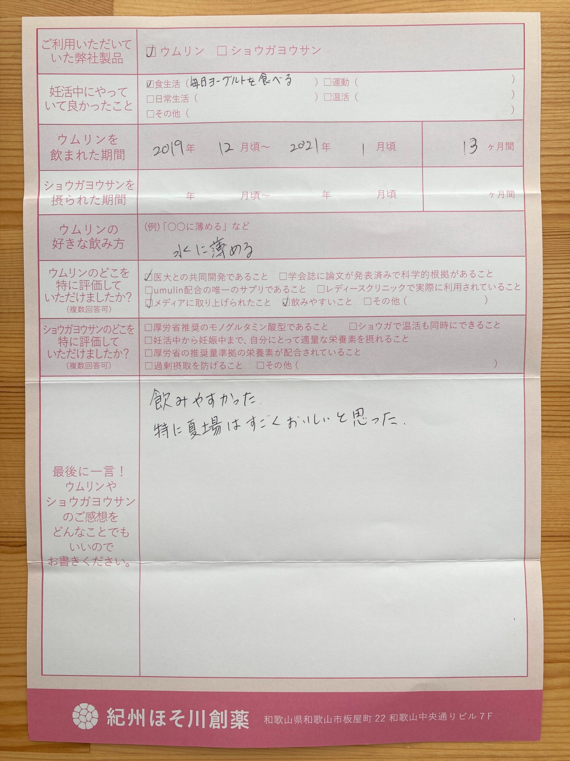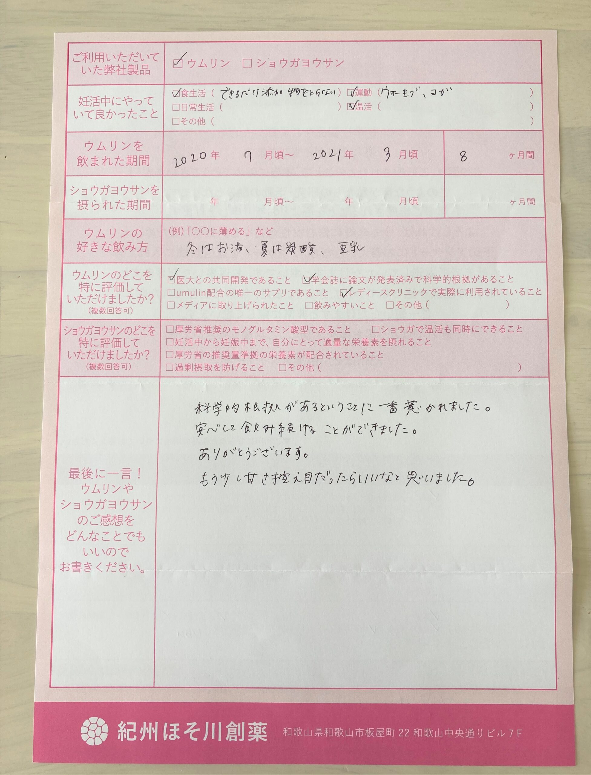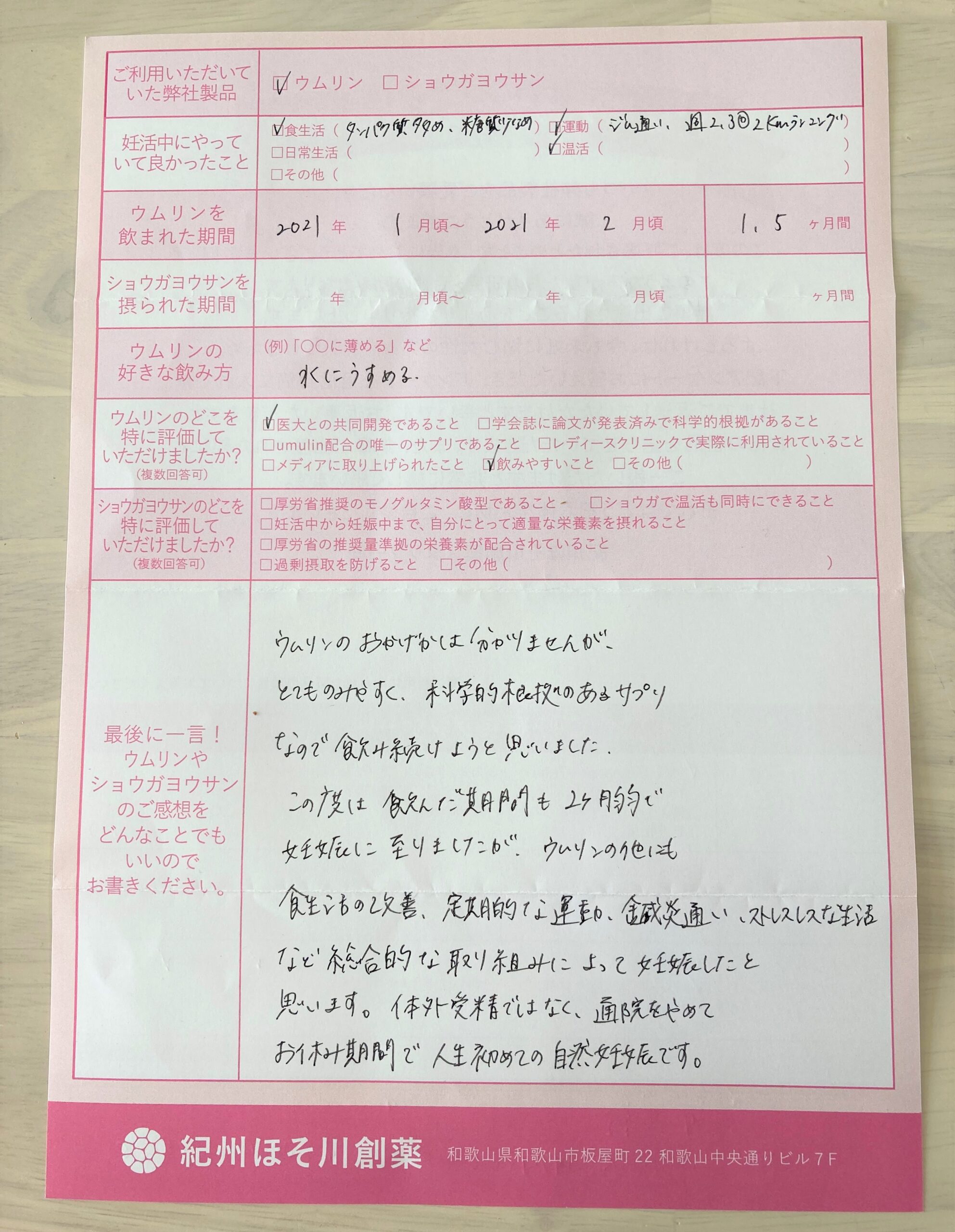 ウムリンのおかげかは分かりませんが、とてものみやすく、科学的根拠のあるサプリなので飲み続けようと思いました。 この度は飲んだ期間も2ヶ月弱で妊娠に至りましたが、ウムリンの他にも食生活の改善、定期的な運動、鍼灸通い、ストレスレスな生活など総合的な取り組みによって妊娠したと思います。体外受精ではなく、通院をやめてお休み期間で人生初めての自然妊娠です。