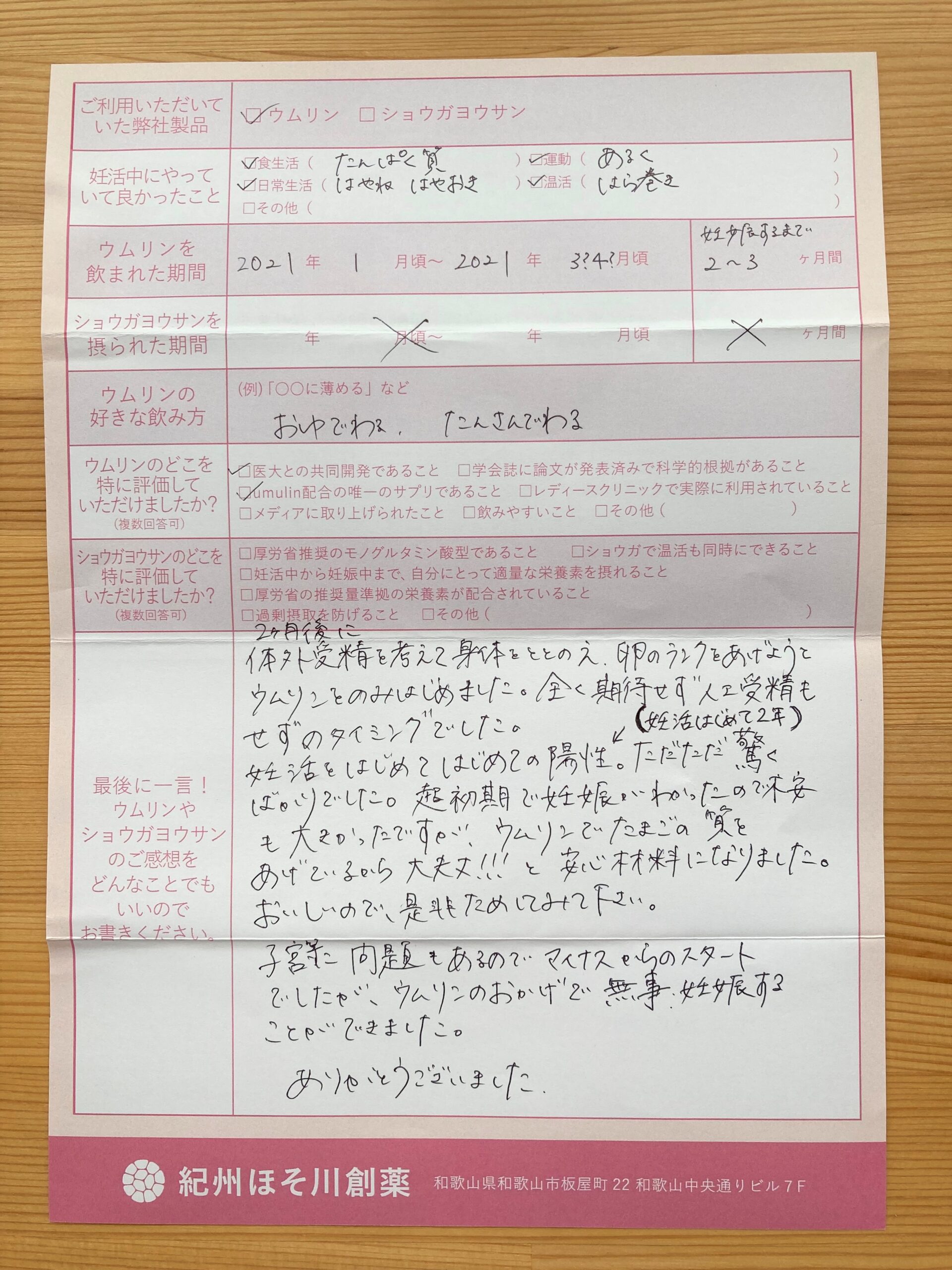 2298 2ヶ月後に体外受精を考えて身体を整え、卵のランクをあげようとウムリンをのみはじめました。全く期待せず人工授精もせずのタイミングでした。 妊活をはじめてはじめての陽性。(妊活はじめて2年)ただただ驚くばかりでした。超初期で妊娠がわかったので不安も大きかったですが、ウムリンでたまごの質をあげているから大丈夫!!!と安心材料になりました。 おいしいので、是非ためしてみてください。 子宮に問題もあるのでマイナスからのスタートでしたが、ウムリンのおかげで無事妊娠することができました。 ありがとうございました。