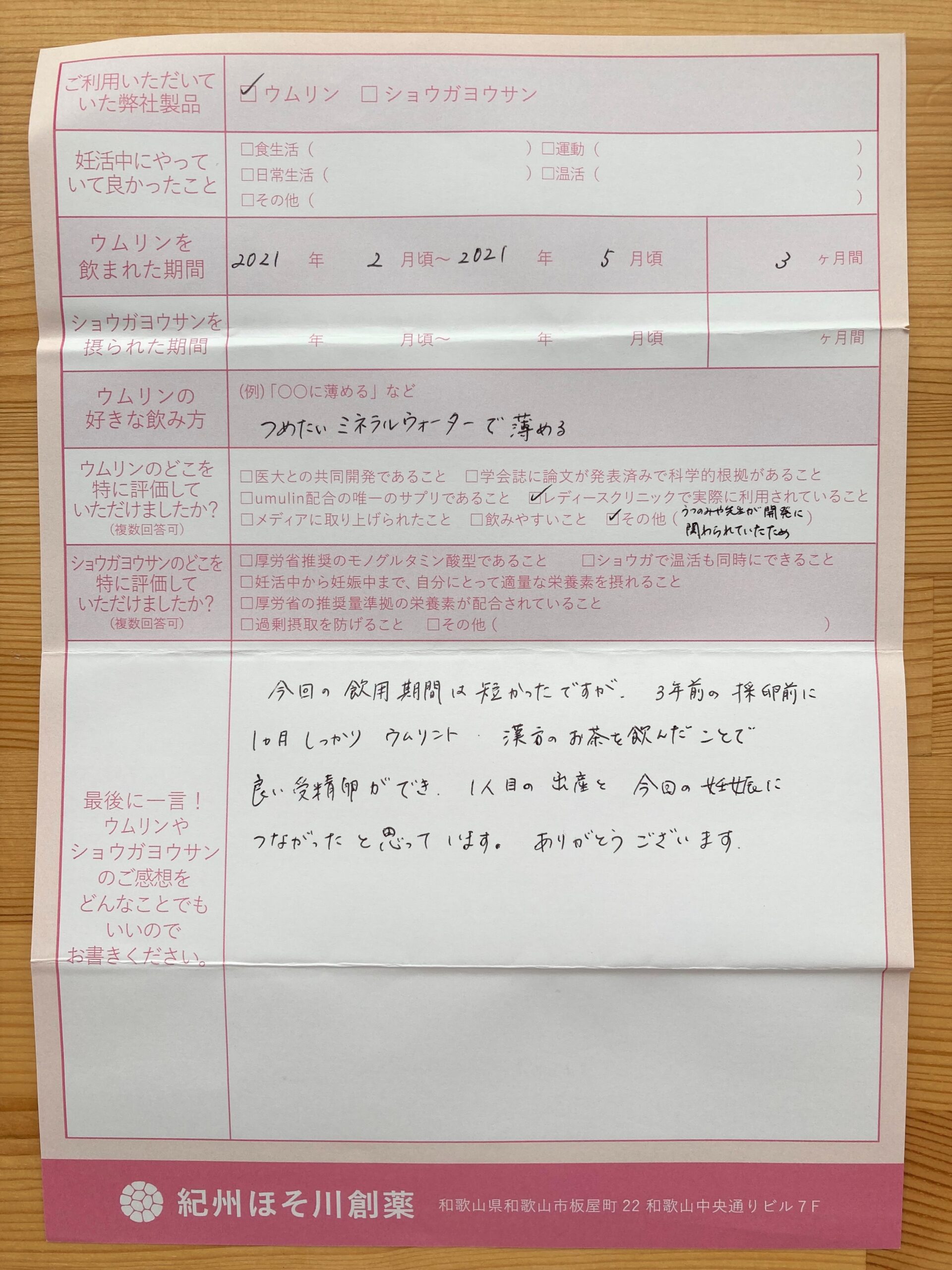 2302 今回の飲用期間は短かったですが、3年前の採卵前に1ヶ月しっかりウムリンと漢方のお茶を飲んだことで良い受精卵ができ、1人目の出産と今回の妊娠につながったと思っています。ありがとうございます。