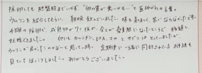 2199 採卵しても胚盤胞までいかず、"卵の質が悪いのかも…"と医師からの言葉。 ウムリンを紹介してもらい、朝晩飲んでいました。味も美味しく、苦にならなかったです。 4回目の採卵で成熟卵が7こ採れ、全てが桑美胚になったところで移植し妊娠できました。 他にもカルニチン、EPA、マカとサプリはとっていましたが、ウムリンが良かったのかな〜と思っています。定期便に一緒に同封されているお手紙も見ていてほっこりしました。ありがとうございました