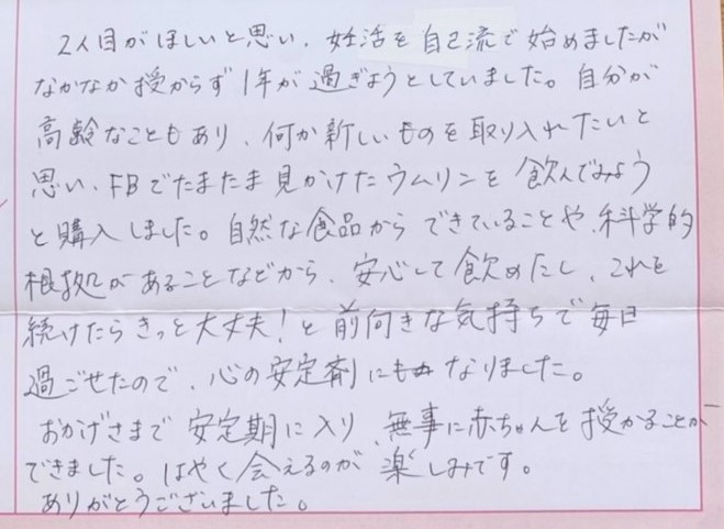 1887 2人目がほしいと思い、妊活を自己流で始めましたがなかなか授からず1年が過ぎようとしていました。自分が高齢なこともあり、何か新しいものを取り入れたいと思い、FBでたまたま見かけたウムリンを飲んでみようと購入しました。自然な食品からできていることや、科学的根拠があることなどから、安心して飲めたし、これを続けたらきっと大丈夫!と前向きな気持ちで毎日過ごせたので、心の安定剤にもなりました。 おかげさまで安定期に入り、無事に赤ちゃんを授かることができました。はやく会えるのが楽しみです。 ありがとうございました。