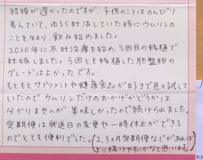 2108 結婚が遅かったのですが、子供のことはのんびり考えていて、ゆるく妊活していた時にウムリンのことを知り、飲み始めました。 2020年に不妊治療を始め、3回目の移植で妊娠しました。3回とも移植した胚盤胞のグレードはよかったです。 もともとサプリメントや健康食品が好きで色々試していたのでウムリンだけのおかげかどうかは分かりませんが、美味しかったので続けられました。定期便は発送日の変更や一時休止ができるのでとても便利でした。(2、3ヶ月定期便などがあればより続けやすいかなと思います。)