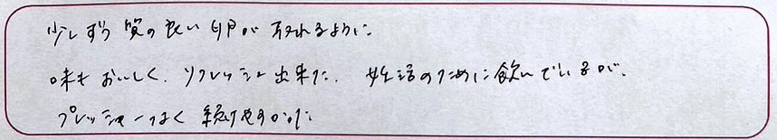 5145 ウムリンを飲むことで、「よし、頑張るぞ!」と自分への栄養剤になっていました。気を張りすぎるのもよくないと思っていたのですが、毎朝飲む習慣がつき、体によいものを摂っているという意識で、朝のだるさをふきとばすスイッチになりました。そして、毎月送られてくるレポートも楽しみで励みになっていました。ありがとうございました。