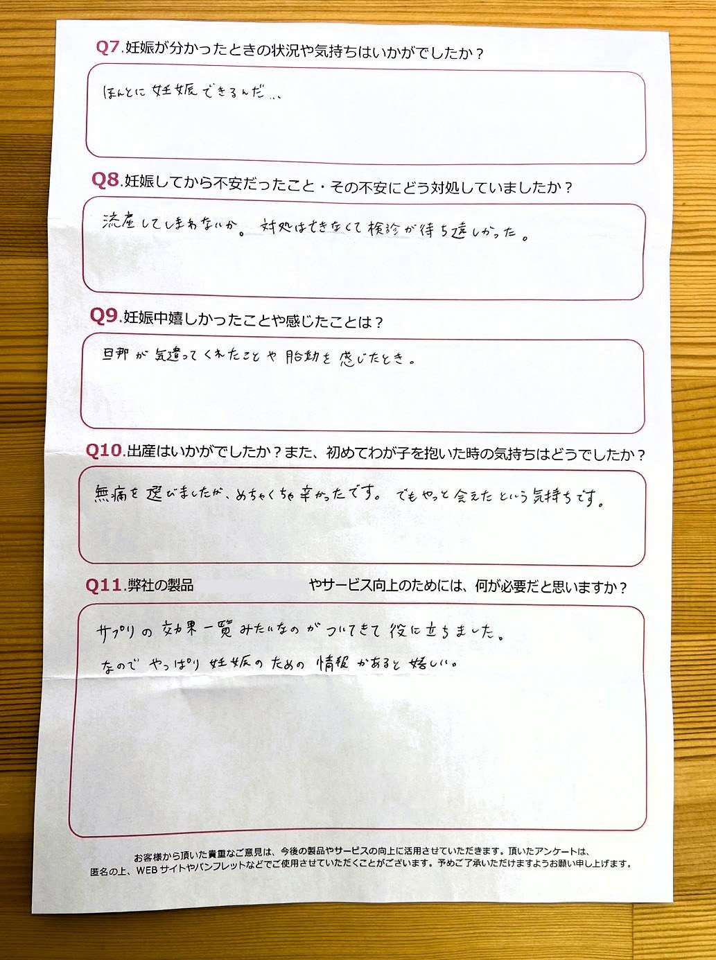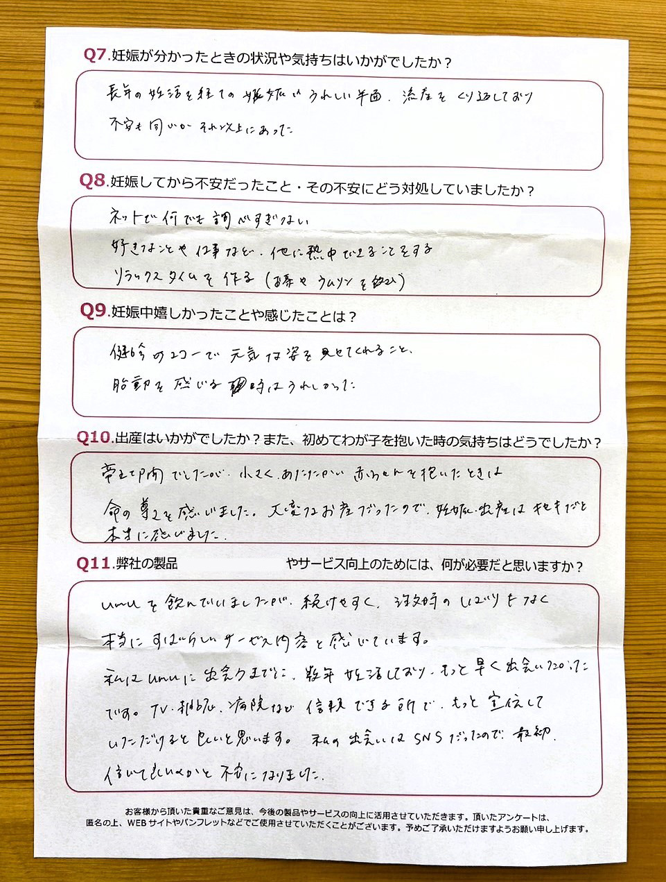 5182 3月に、7年間不治療をしていた友人が妊娠した事を知り、何をしていたのか聞いた所、『ウムリン良かったよ!』とオススメされ、その日に定期購入を契約しました。私自身も4年不妊治療をしていたので、藁にもすがる思いでした。23年1月から顕徴を開始し、1回目の採卵は”1つ”しか取れず、卵が育つのが遅い身体である事がわかりました。しかし、ウムリンを飲んでいどんだ2回目の採印で”7つ”も取れ、卵の成長が基準値になっている事がわかりました。すぐに効果が出たのは、びっくりでしたし、エグかったです。本当にエグい。さらに、3回目の採卵では、”10個”取れ、卵のも上がっていた為、8月31日に陽性判定をらいました。4年半の治療は本当に辛かったです。現在7ヶ月目に入り、毎日の胎動に感動しています。ありがとうを何億回言っても足りないです。ウムリンに出会えて大変感謝しています。残り数日のマタニティライフ、そしてこれから始まる新しい生活にワクワクしながら過ごしていきます。