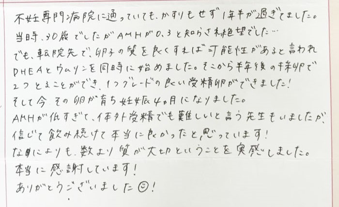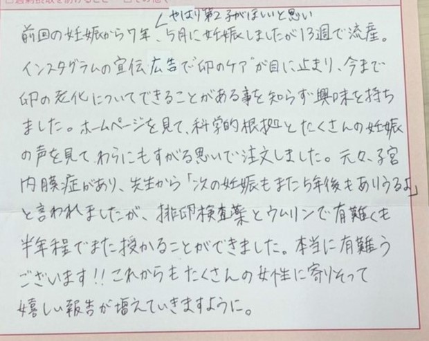 前回の妊娠から7年、やはり第2子が欲しいと思い5月に妊娠しましたが13週で流産。インスタグラムの宣伝広告で"卵のケア"が目に止まり、今まで卵の老化についてできることがある事を知らず興味を持ちました。ホームページを見て、科学的根拠とたくさんの妊娠の声を見て、わらにもすがるある思いで注文しました。元々、子宮内膜症があり、先生から『次の妊娠もまた5年後もありうるよ』と言われましたが、排卵検査薬とウムリンで有り難くも半年程でまた授かることができました。本当に有難うございます!!これからもたくさんの女性に寄りそって嬉しい報告が増えていきますように。