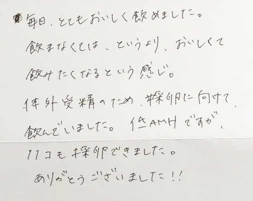 なかなか妊娠できず、婦人科で検査したところ私はAMHがとても低く卵子の残りがとても少ないことを知り急いで体外受精をしました。しかし初回の採卵では4 AC、4 BCとあまりグレードの良い胚ができず、妊娠に至らず…。何とか卵の質を良くしたい!と思い始めたのがウムリンでした。私は元々梅が苦手なので、ウムリンの味は大丈夫かな?と心配だったのですが、慣れてしまうとむしろ美味しく感じ、夏のお風呂上がりにウムリンを飲むのは至福の時でした。 (夏バテにも効いてたような…?)ウムリンを飲み始めて約半年後に2回目の採卵をしたところ、初めて4AAと言うグレードの良い胚ができて、その胚により妊娠できました。この妊娠はウムリンのおかげかなと思っております。本当にありがとうございます。