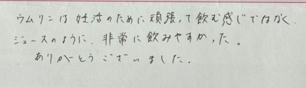 ウムリンは妊活のために頑張って飲む感じではなく、ジュースのように、非常に飲みやすかった。ありがとうございました。