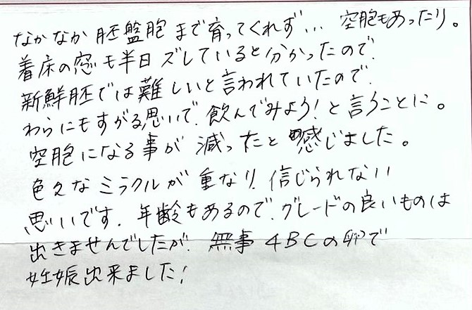 4986 なかなか胚盤胞まで育ってくれず…空胞もあったり。着床の窓も半日ズレていると分かったので、新鮮胚では難しいと言われていたので、わらにもすがる思いで、飲んでみよう!と言うことに。空胞になる事が減ったと感じました。色々なミラクルが重なり、信じられない思いです。年齢もあるので、グレードの良いものは出きませんでしたが、無事4BCの卵で妊娠出来ました!